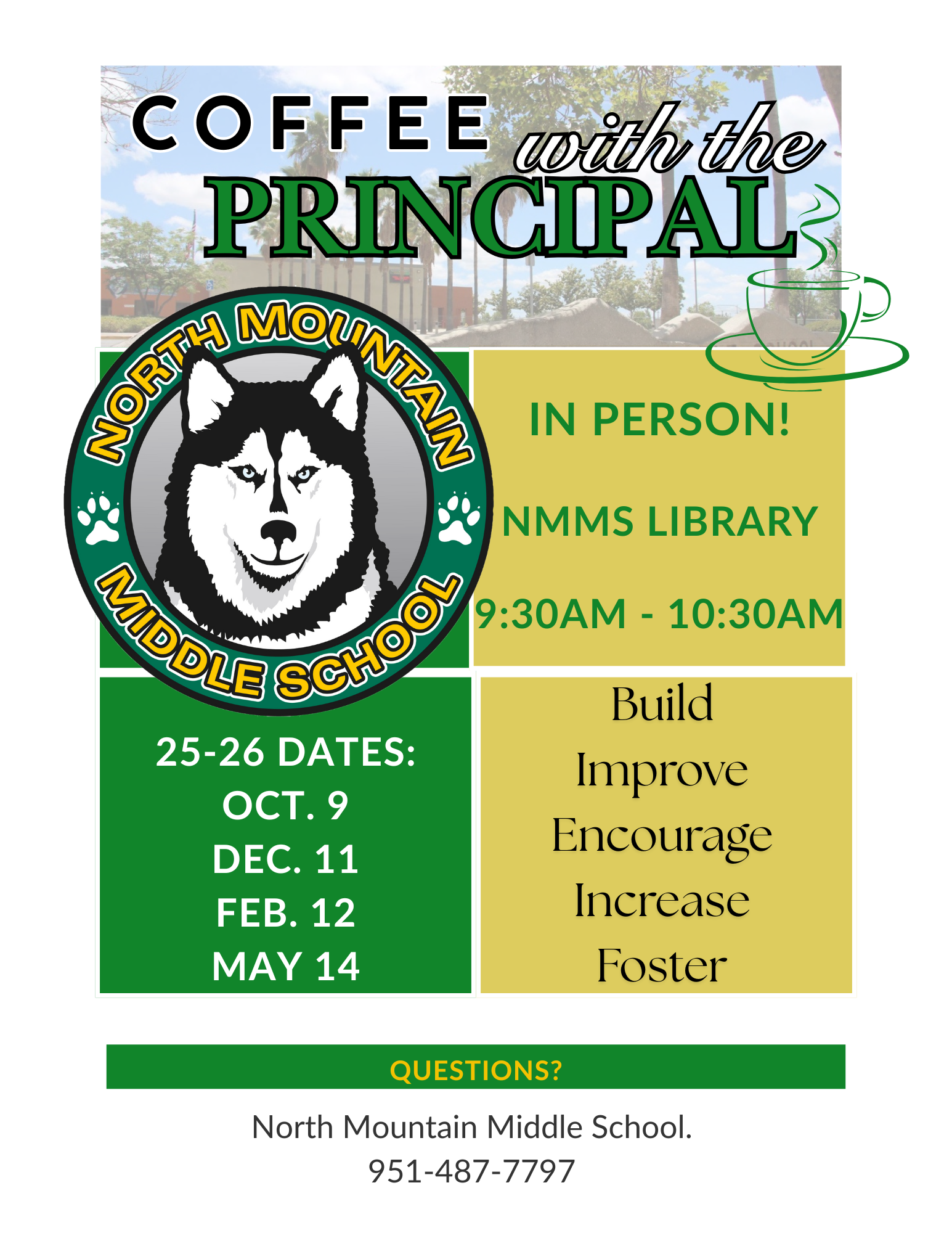 Coffee With the Principal Dates Announced Coffee With the Principal In Person located in the NMMS Library 9:30 AM - 10:30 AM Dates Are As Follows: October 9th December 11 February 12 May 14 Print