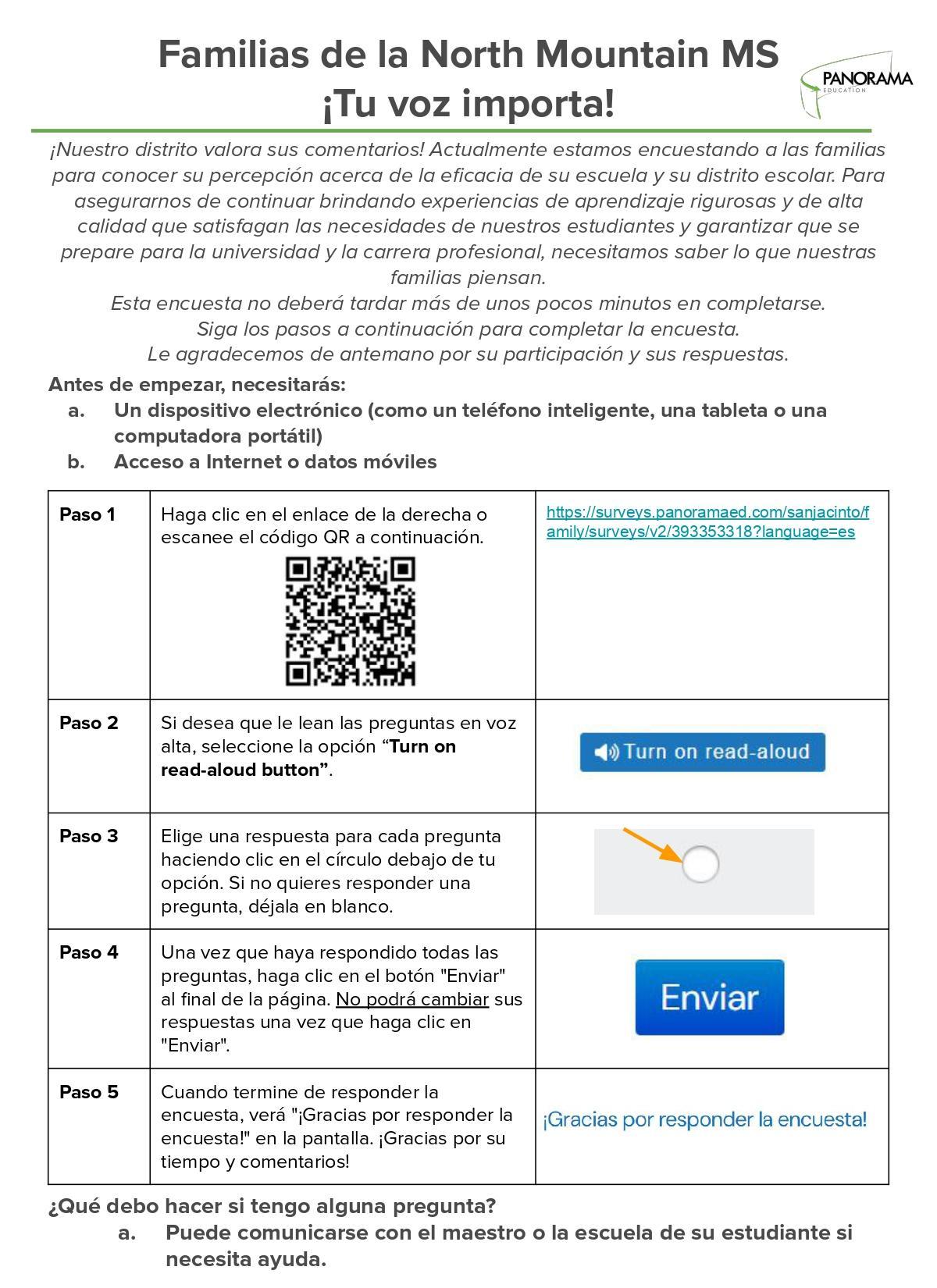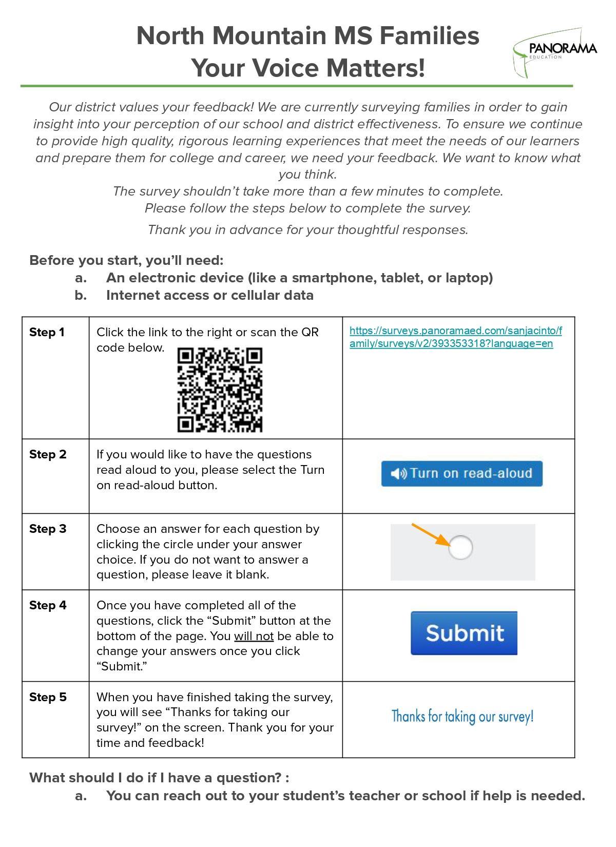 Please take a few minutes to fill out our Spring Panorama Survey for parents. Your feedback allows us to better serve your child while also giving us data to better improve our performance and value to the community.